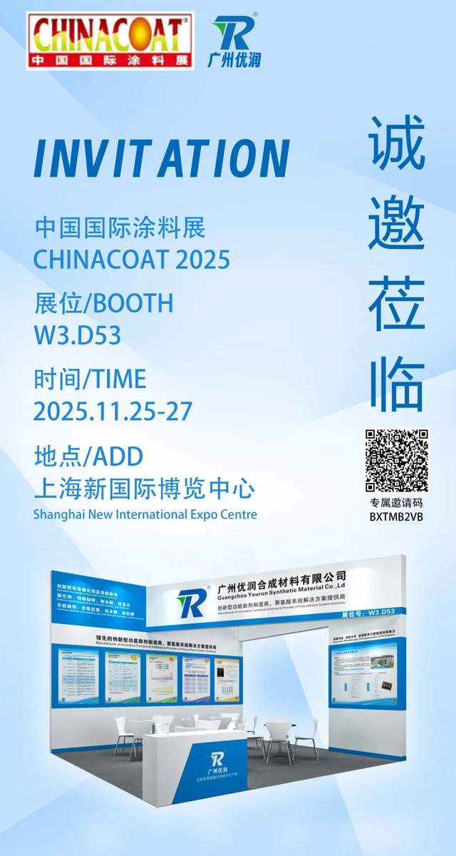 2025中国国际涂料展CHINACOAT 将于2025年11月25日-27日在上海新国际博览中心盛大举行。届时,我司将在W3展馆D53展位展示一系列聚氨酯行业适用的产品,优润诚意邀请您的莅临参与,与您一起探讨交流,期待您的到来!
