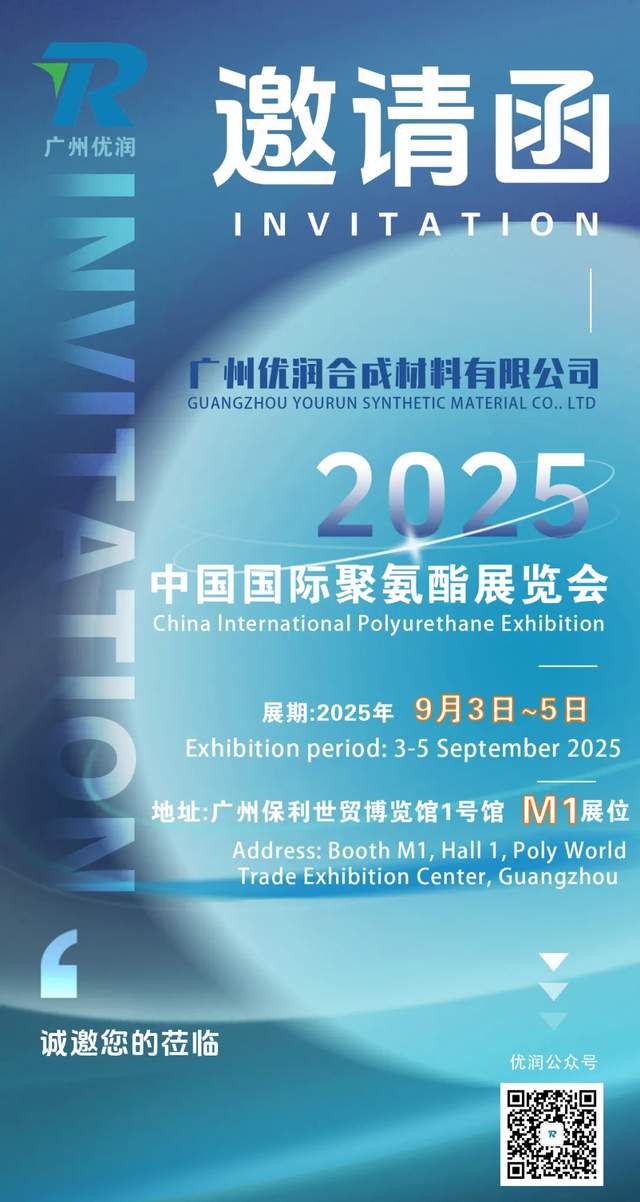您好!感谢您长期以来对广州优润的关注和支持。第二十一届中国国际聚氨酯展览会将于2025年09月03日-05日在广州保利世贸博览馆1号馆盛大举行。届时,我司将在1号馆M1展位展示一系列聚氨酯行业适用的产品,优润诚意邀请您的莅临参与,与您一起探讨交流,期待您的到来!